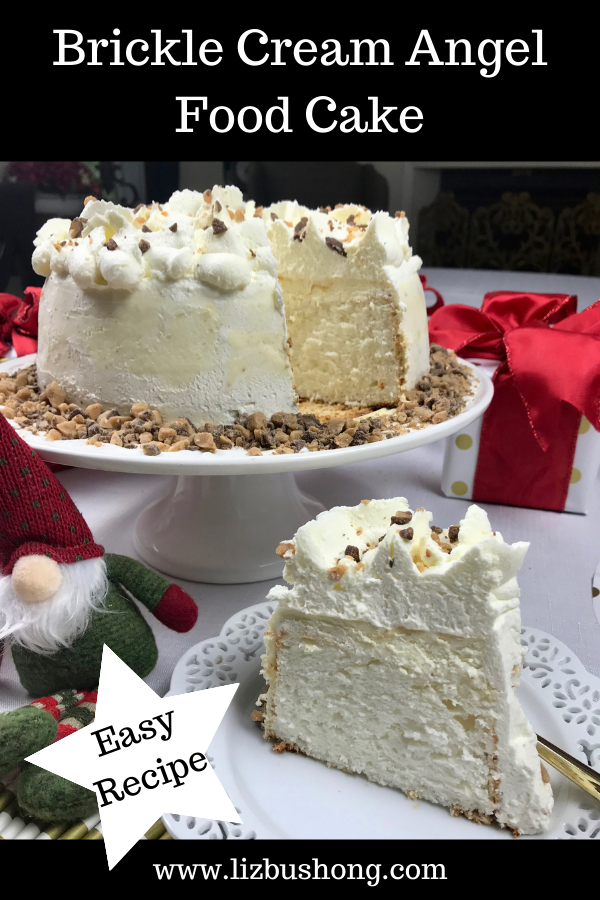 Light and fluffy Angel Food Cake is made with Duncan Hines Angel Food Cake Mix, baked, chilled, and frosted with fresh whipped cream. Piped with decorative tip # 882 or 883 St. Honore tip. Cake is sprinkled with Heath Bar Brickle.