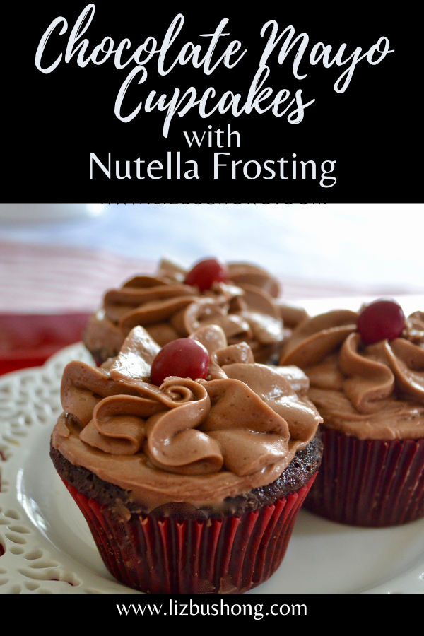 Need a quick chocolate cake or cupcakes? Make this chocolate mayonnaise cake or cupcakes in less than 45 minutes. Dark chocolate cocoa powder and Hellman’s mayonnaise are two key ingredients in this recipe. This cake is moist and delicious. No need for eggs in this recipe, the mayonnaise replaces. Super simple recipe with delicious flavor especially with Nutella hazelnut frosting.