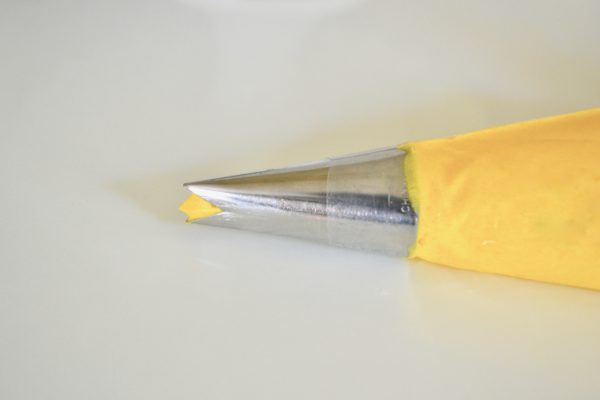 I used my favorite buttercream frosting recipe and tinted with 3 drops of golden yellow food coloring gel. (Be sure to use color gel and not liquid food coloring for the gel will color the frosting without making it thin in consistency.)
