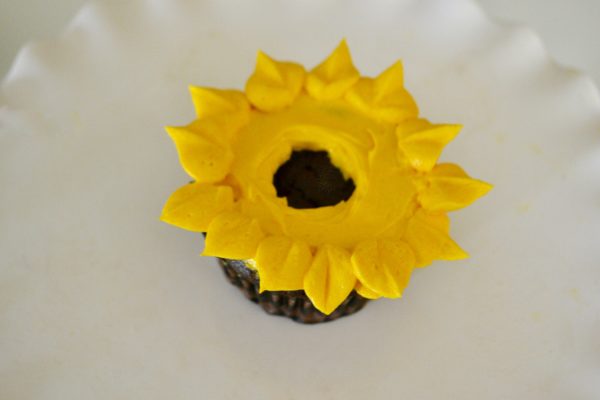- With small offset spatula spread buttercream around the perimeter of cupcake and leave the center open. Buttercream should be welled up on the sides to create depth of sunflower and a well to hold the ganache center.